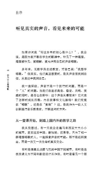 全书分为多个主题篇章,从“认清角色”、“唱歌的动机与现代审美”到“比赛与舞台的心态管理与自我重建”,再到“未来的声音教育”,每一章都像一堂启迪思维的课,让读者重新认识“声音”与“人”之间的关系。