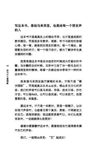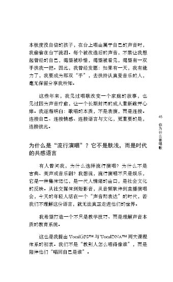 在这个讲求技巧与表现的时代,许多人在追求完美音准与炫技之余,渐渐忘了声音的源头。书中指出,歌唱不仅是肌肉与气息的协调,更是一种自我认知与情绪表达的修行。作者以温柔而坚定的文字,揭示唱歌背后的人文与心理层面——声音如何映照我们的身体、性格与生命经验。