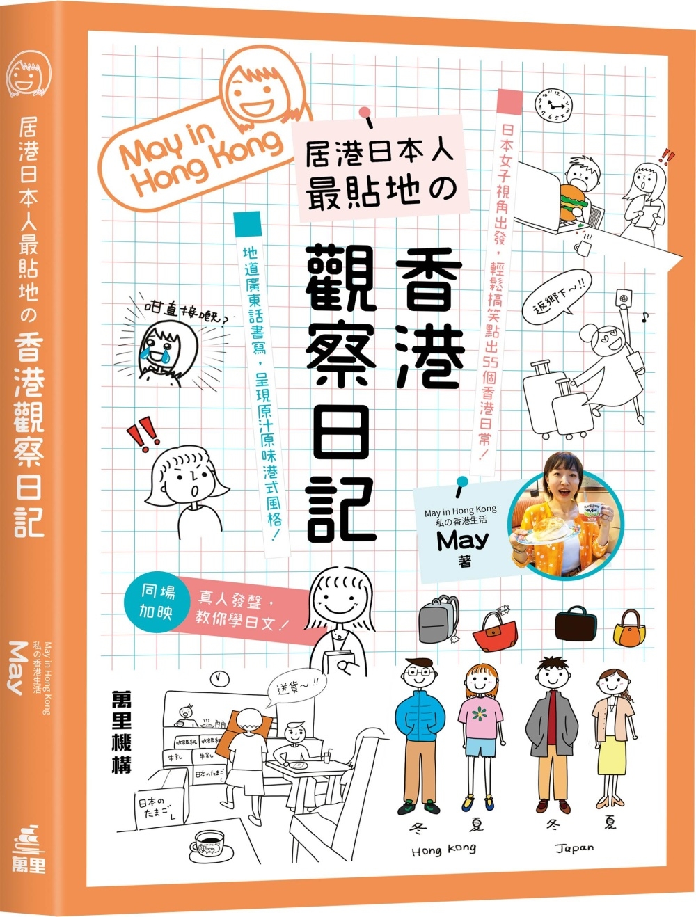 居港十年的日本女生May,從北海道搬來香港,由單身到已婚,每天活在文化差異中,依然用好奇的眼光觀察香港。今次由Youtuber搖身一變成為作者。從街上垃圾桶、小心地滑牌,到霓虹招牌、加三蚊凍飲,她依然會「驚訝到嘩一聲!。這是她眼中的香港,也是我們熟悉卻忽略的日常風景。本書以居港日本人的角度,以輕鬆的筆觸及廣東話文法,帶大家深入了解香港人及日本人在生活層面,例如職場文化、交通配套,戀愛方式等的文化差異。