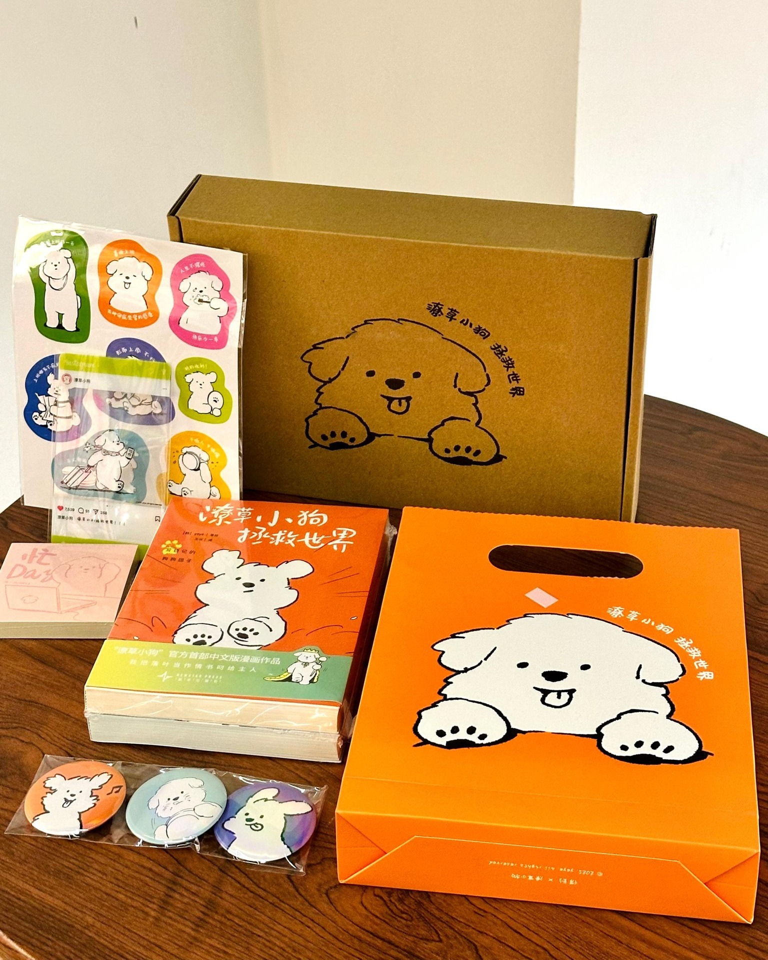 这套《潦草小狗拯救世界》是礼盒装版本,随书附赠:徽章+贴纸+拍立得+便签本。