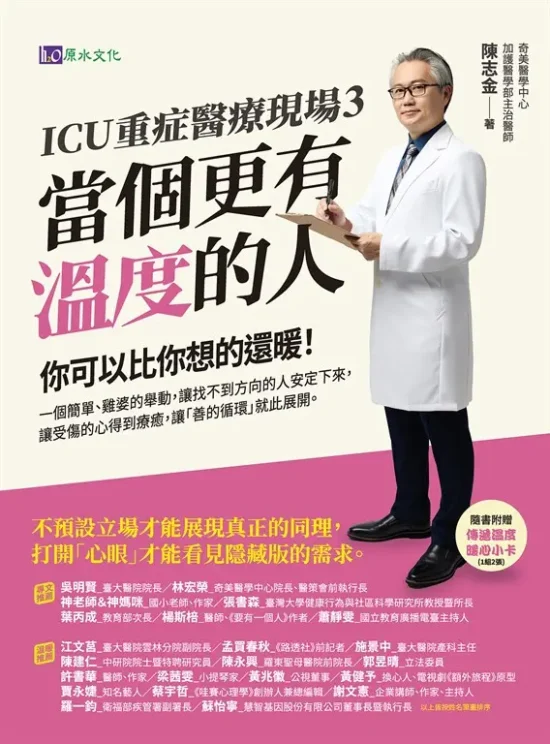相關著作:《ICU重症醫療現場3:當個更有溫度的人》《ICU重症醫療現場:熱血暖醫陳志金 勇敢而發真心話》