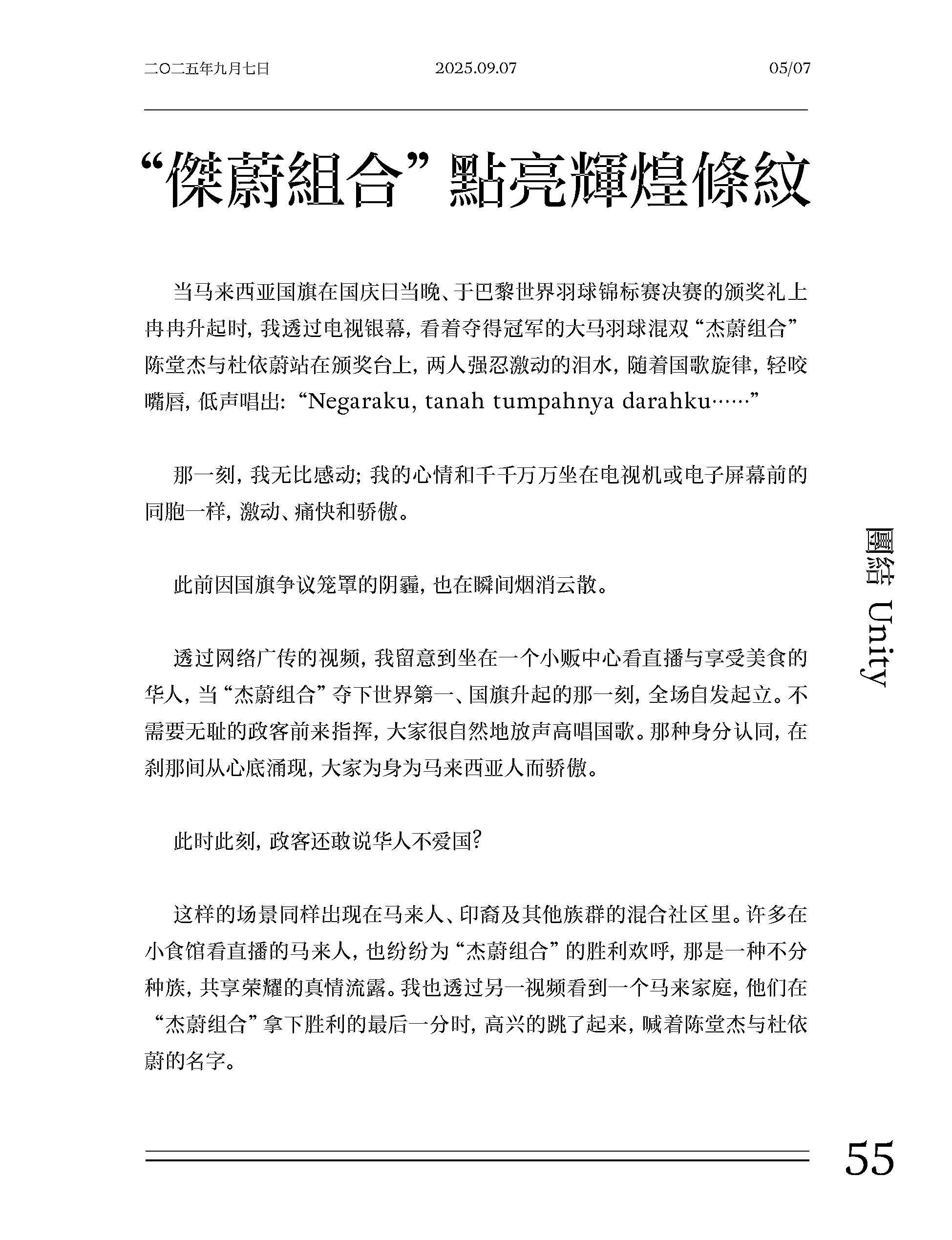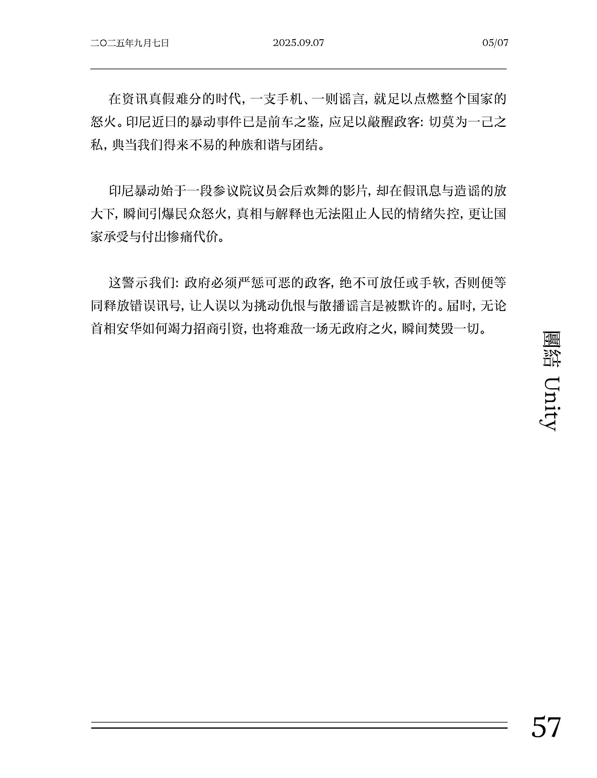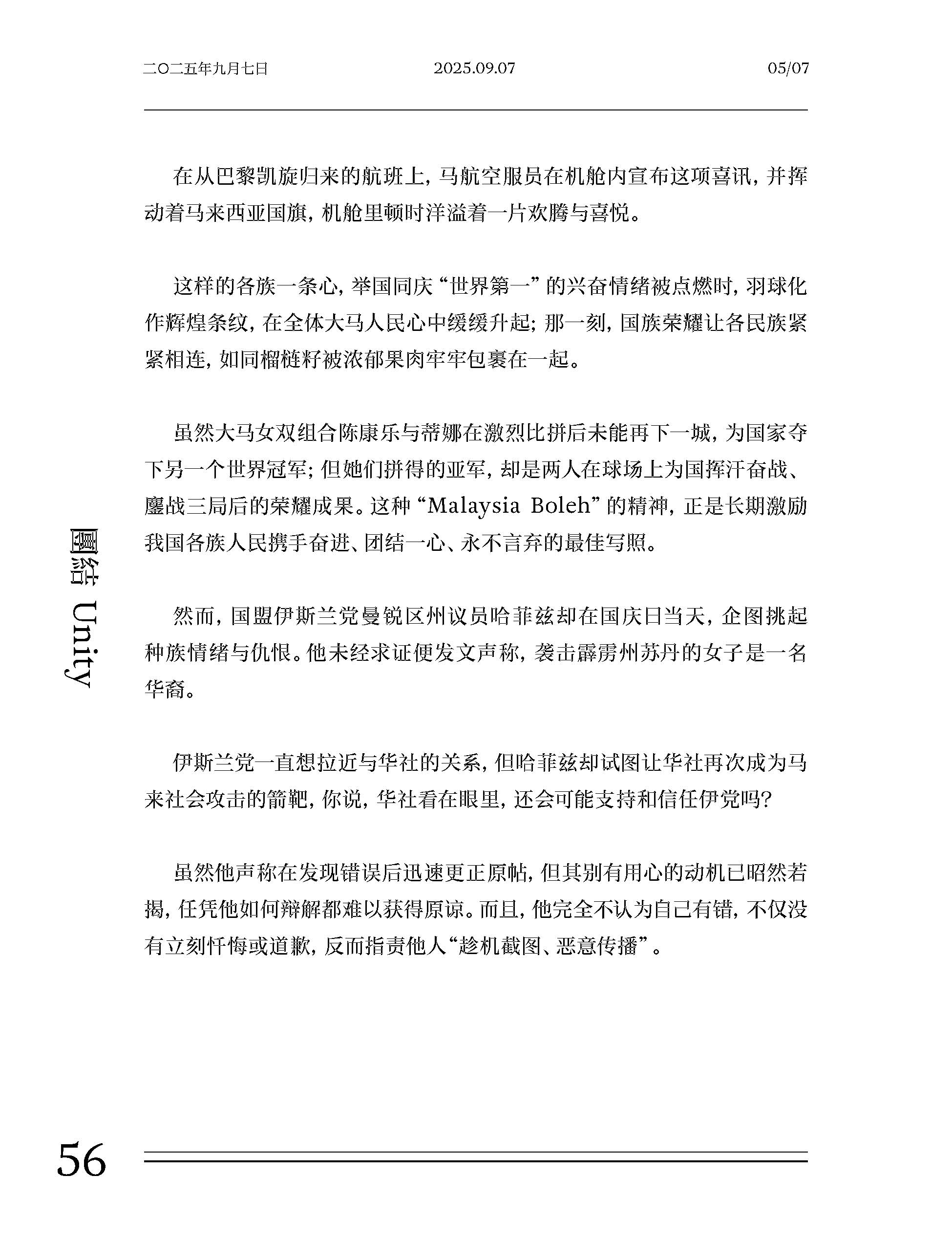 在团结议题上,郭清江直言部分政客通过煽动对立与操弄情绪谋取政治利益,同时强调“心中有爱,眼中万物皆 Halal”。通过对国旗绘图错误事件的反思,他揭示了种族政治、极端言论与双重标准对新闻自由与社会包容的深层伤害,并指出当爱国被执法化与标签化时,国旗便逐渐失去凝聚人心的力量。